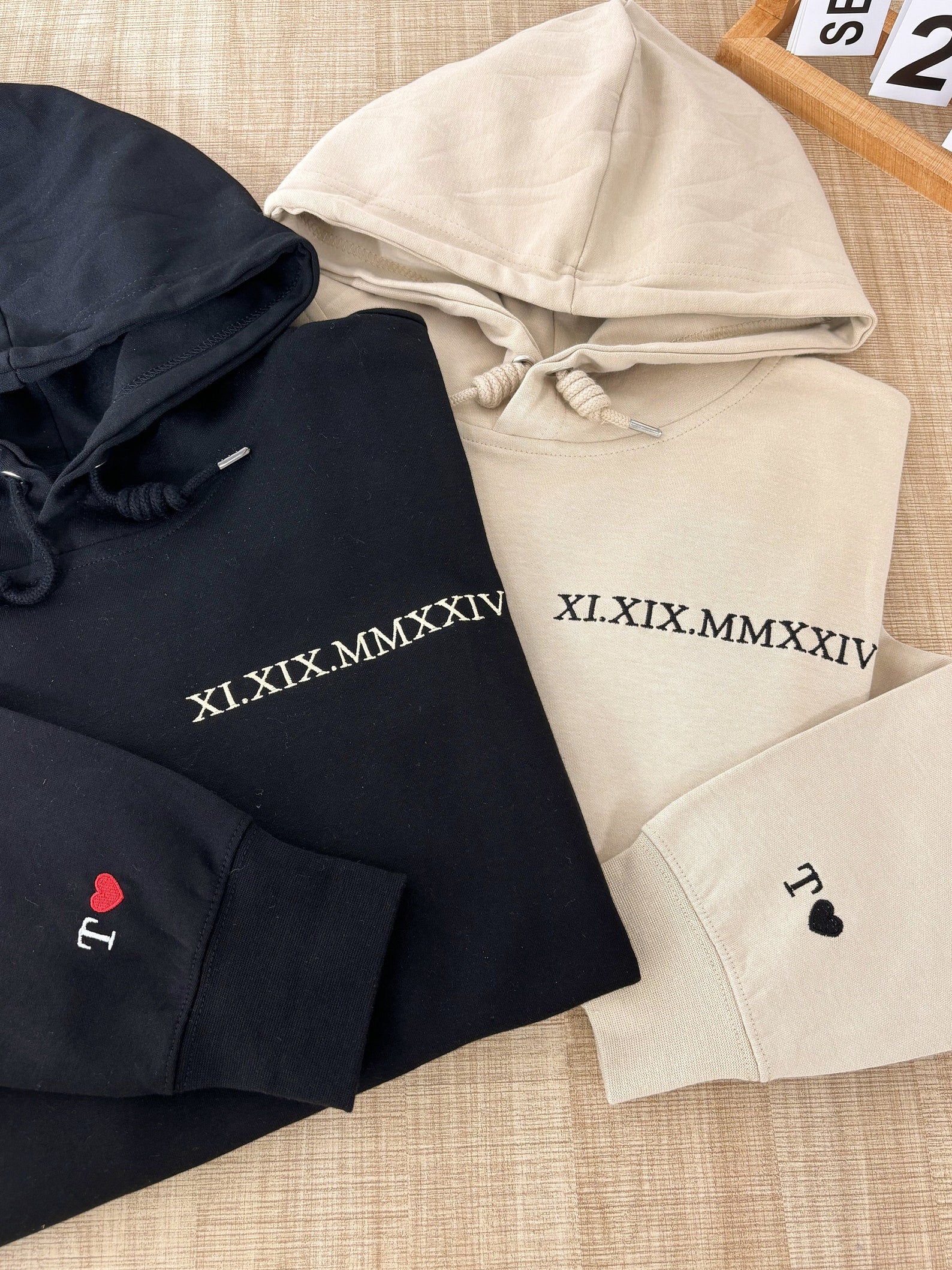 Felpa con cappuccio con numeri romani ricamati | Felpa con cappuccio per coppia con data di anniversario | Iniziali sulla manica | Regalo di Natale personalizzato per San Valentino BEST SELLER