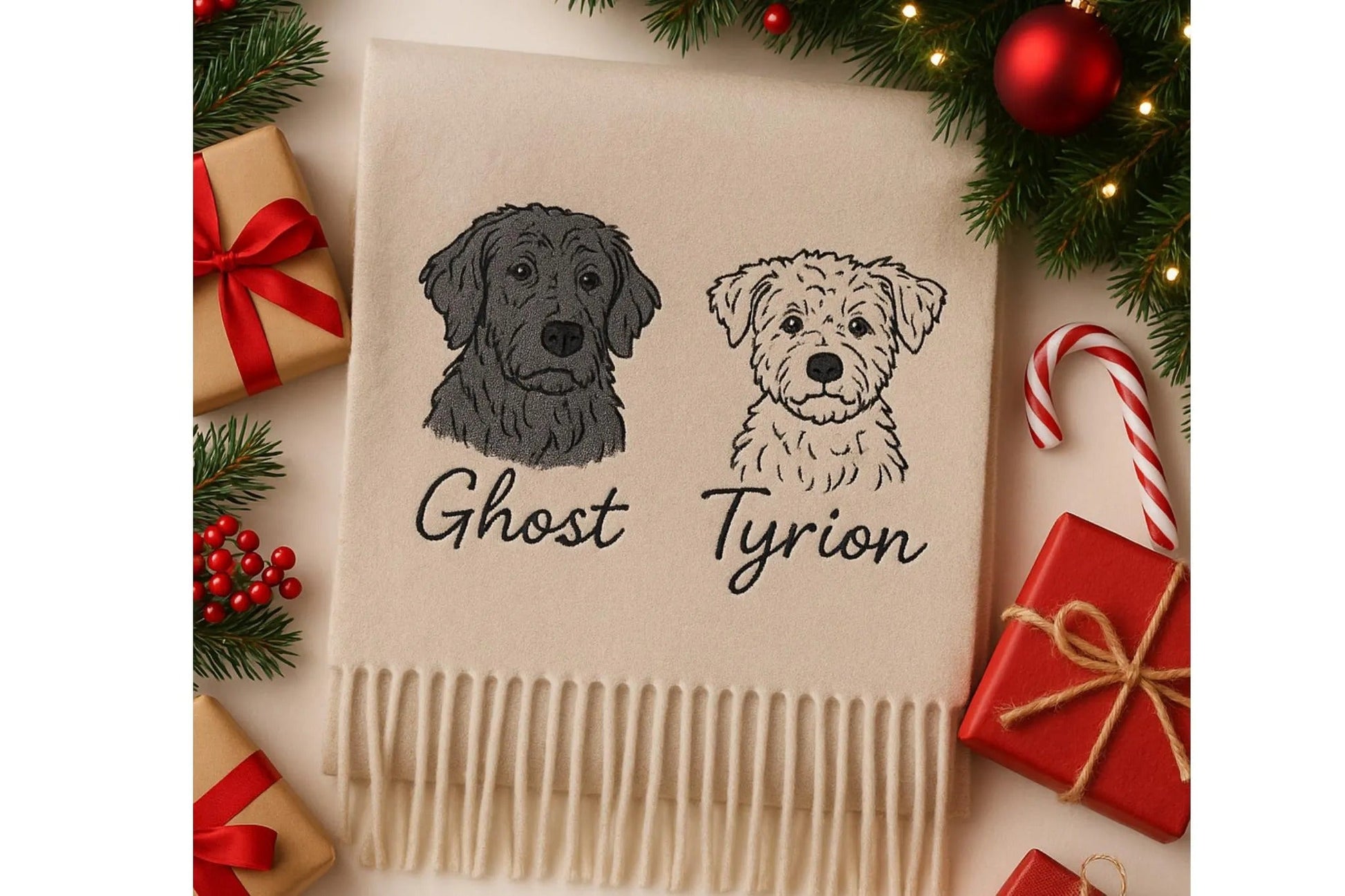 Sciarpa di lana ricamata con volto di animale domestico – Regalo personalizzato per gli amanti degli animali